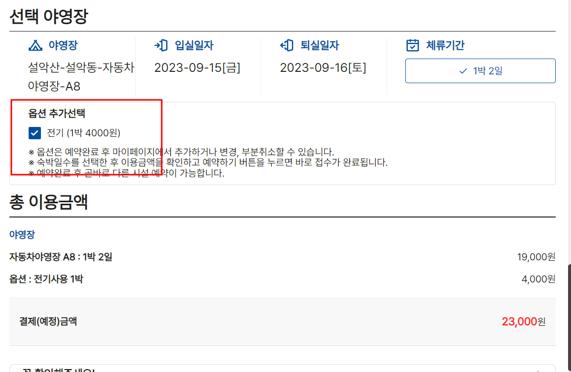 그리고 "다음단계"를 클릭합니다. 아래 오른쪽 이미지처럼 이용료 금액이 나오고 아래 예약하기 버튼을 누르면 완료입니다. 전기사용은 4000원인데 옵션이니 처음부터 바로 선택해서 결제 마시고 야영장 이용하는 날 전기가 필요하다면 관리사무소를 통해 말씀하고 추가 비용 납부하시는 것을 추천합니다.