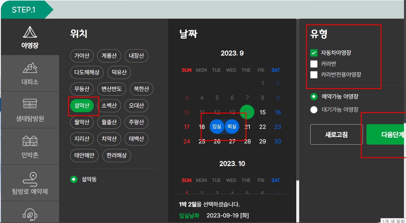 예를 들어 다가오는 10월1일부터 10월 15일까지 설악동 야영장을 이용할 계획이라면