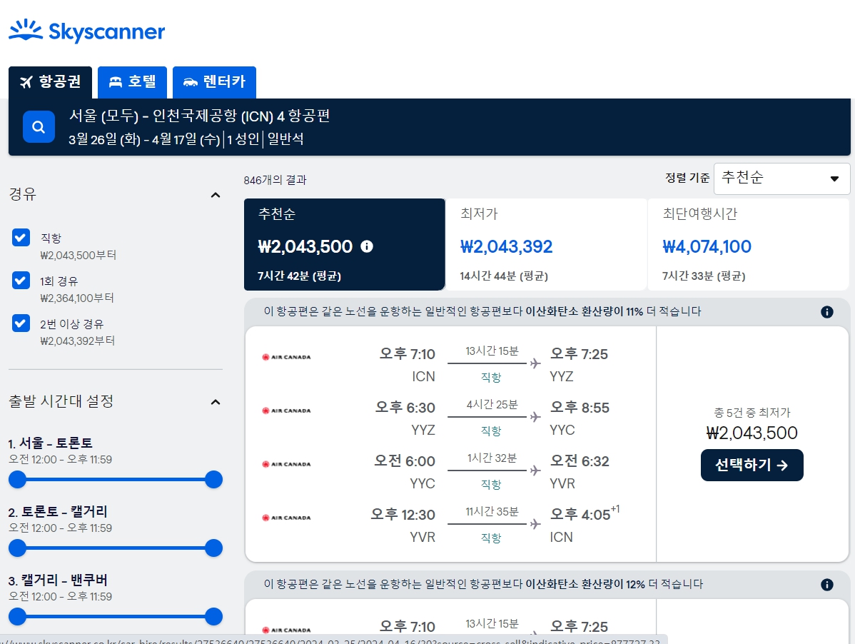 캐나다를 중심으로 찾았더니 국적기 에어캐나다로 찾아주네요.