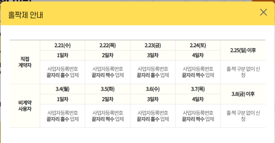 그러므로 첫 날인 21일 오늘은 사업자등록번호가 홀수로 끝나는 분만 가능합니다.