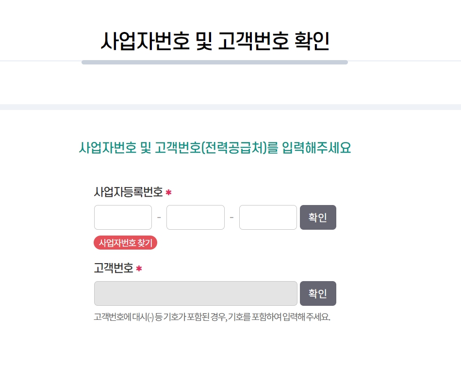 예 또는 아니오로 체크를 합니다. 다음페이지 이동하면 사업자번호 기입과 한국 전력 고객번호를 입력하시면 됩니다.