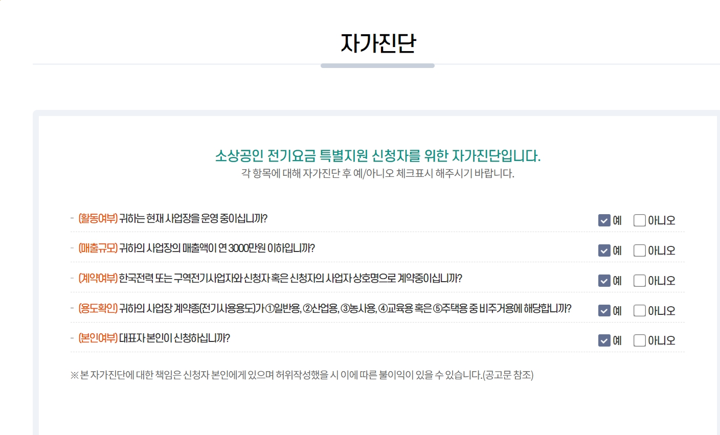 - 일반용, 산업용, 농사용, 교육용 혹은 주택용(비거주용)의 전기요금을 납부하고 있는 사업자