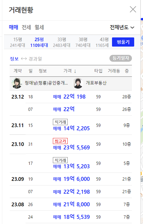 최근 25평 (59형) 은 약 22억에 거래되었습니다.