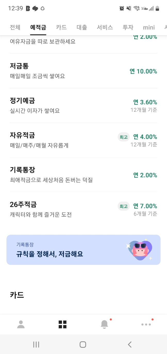가입을 하고 나면 위에 상단메뉴에서 예적금을 선택하고