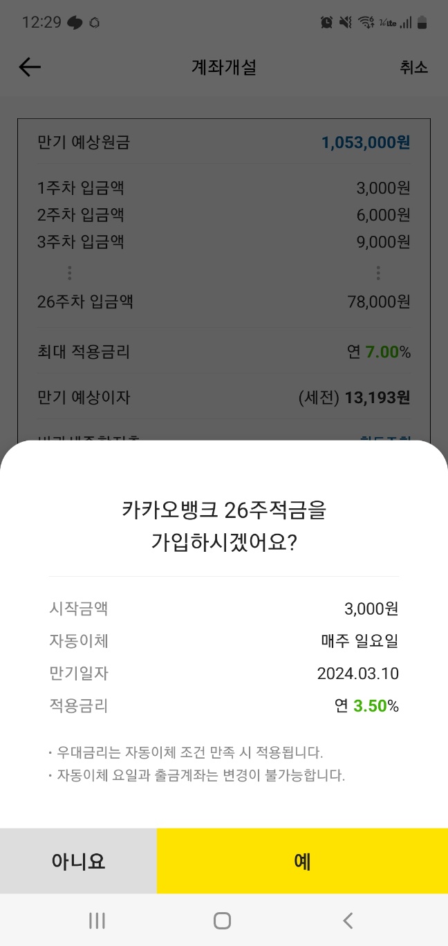 "예" 클릭하고 나면 적금개설이 된다. 가입한 요일이 매주 자동이체 기간이다.