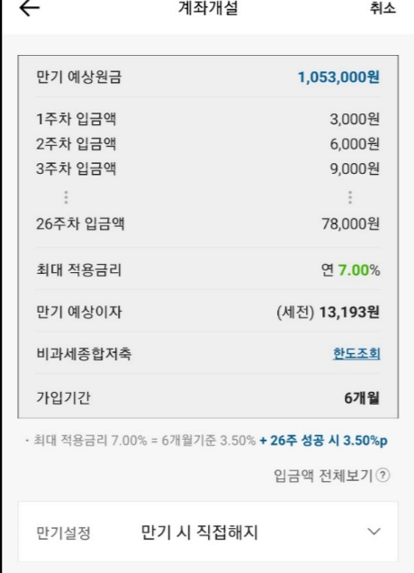 3000원으로 적금개설 후 26주동안 잘 납부하면 최대 1053000원의 예상금액을